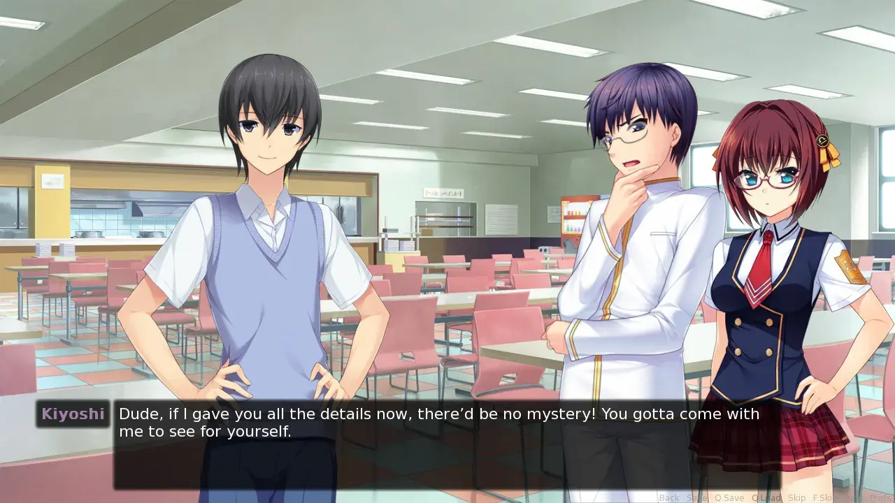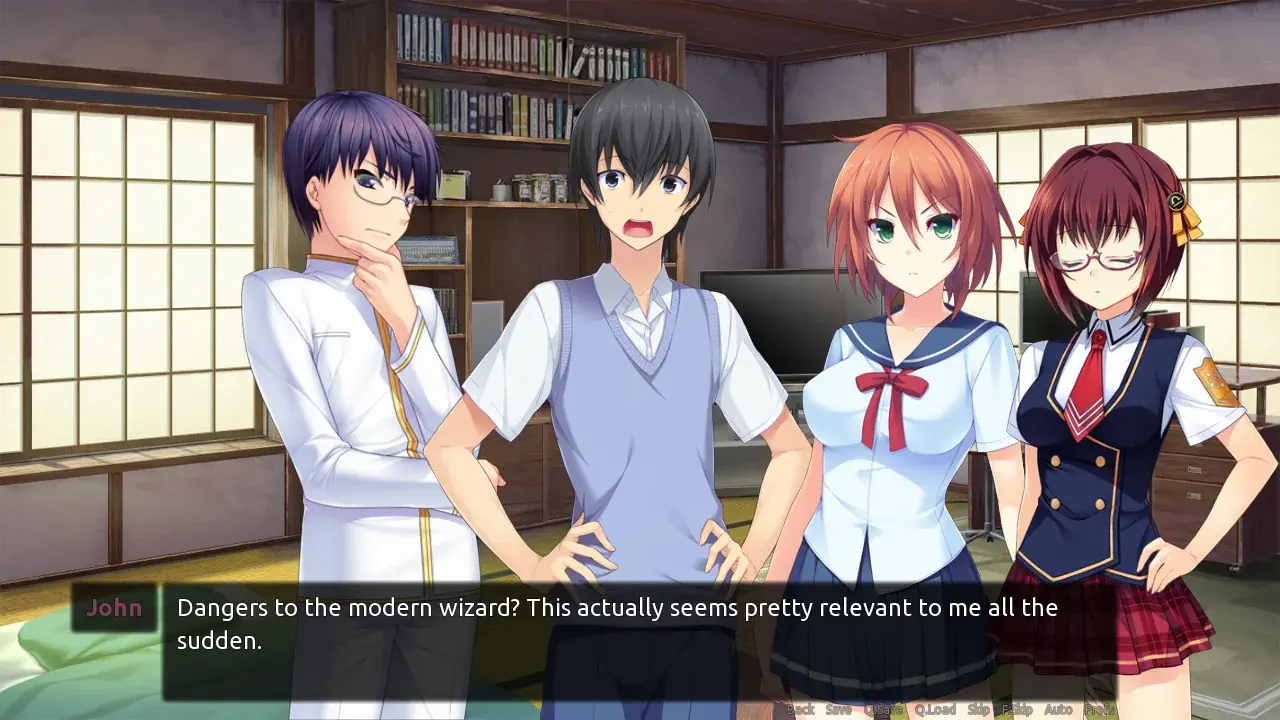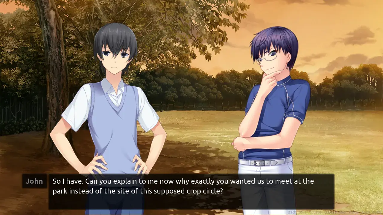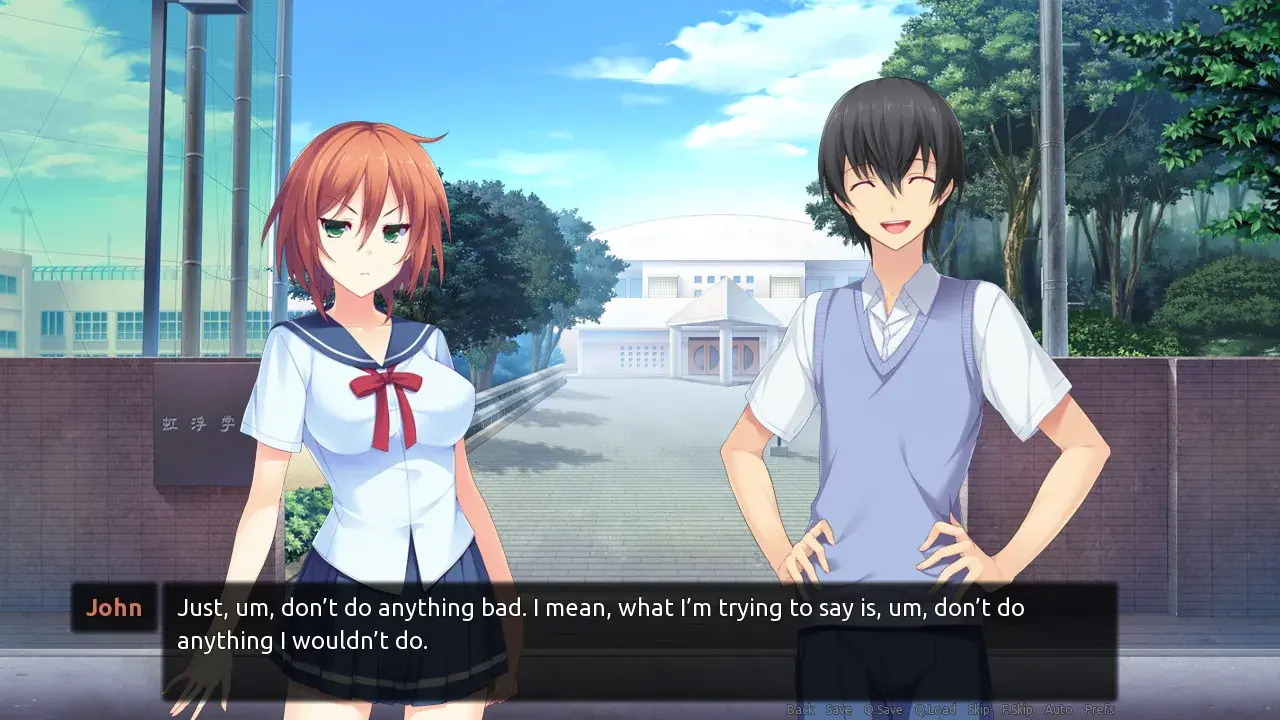 The story is told through the perspective of the main character John, using a first person narrative while using a traditional text and sprite-based visual novel model.